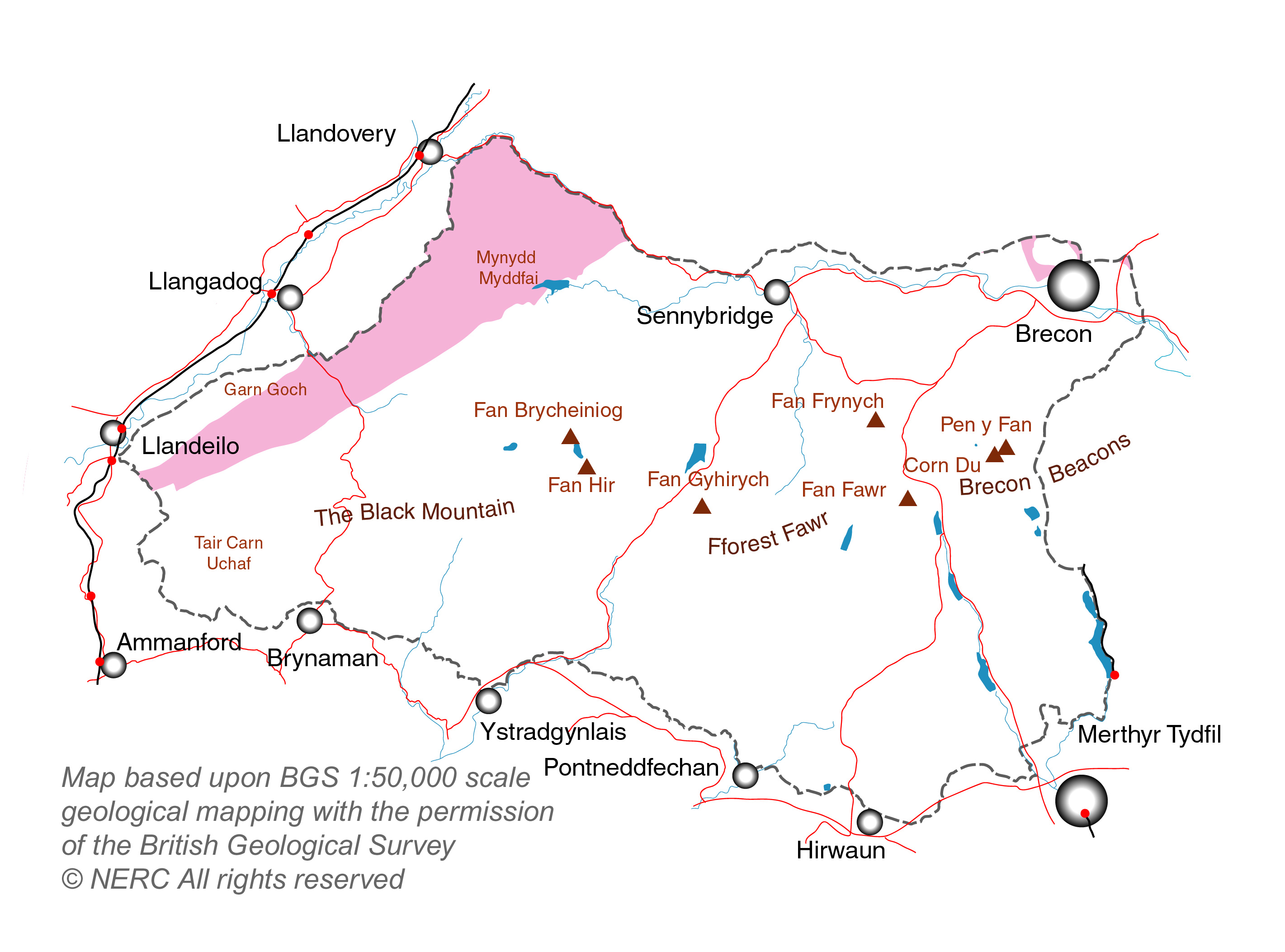Map showing extent of the outcrop of the Silurian rocks of Fforest Fawr Geopark